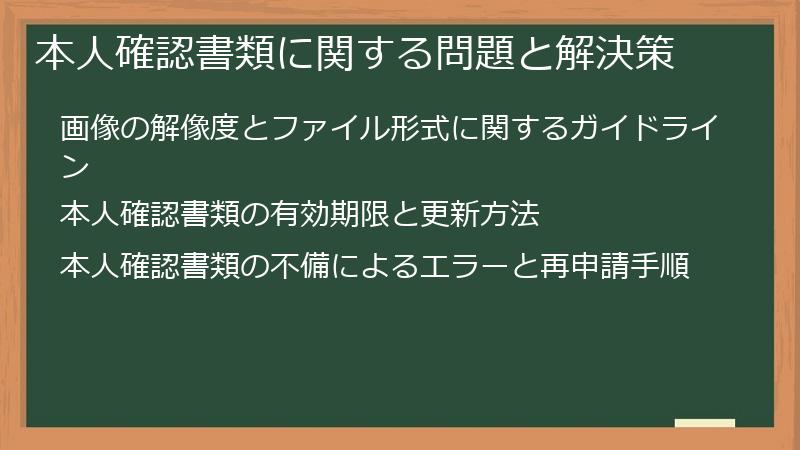 本セクションでは、本人確認書類に関するよくある問題点とその解決策を説明します。