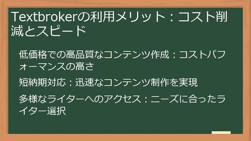 - Textbrokerを利用することで、以下のようなメリットが享受できます。