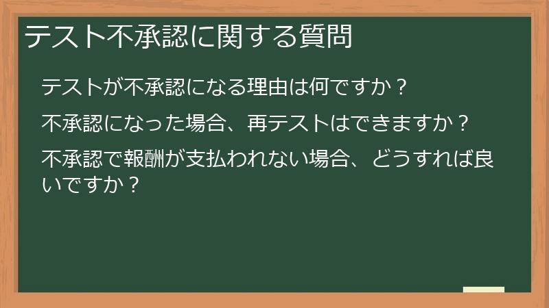 具体的には、テストの指示に従って実施したにも関わらず、不承認となるケースや、不承認理由の説明が不十分で、改善策を提示してもらえないケースなどが報告されています。