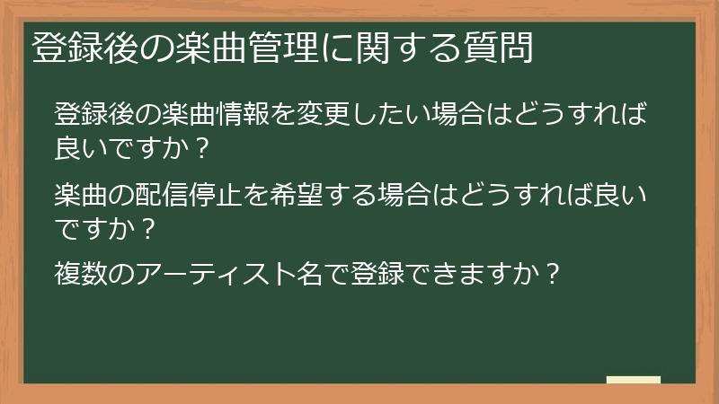 - 異なるサービスに楽曲を登録する場合でも、著作権情報(アーティスト名、楽曲名、作詞者、作曲者など)は、可能な限り統一しましょう。 情報に不一致があると、著作権管理や収益分配に混乱が生じる可能性があります。