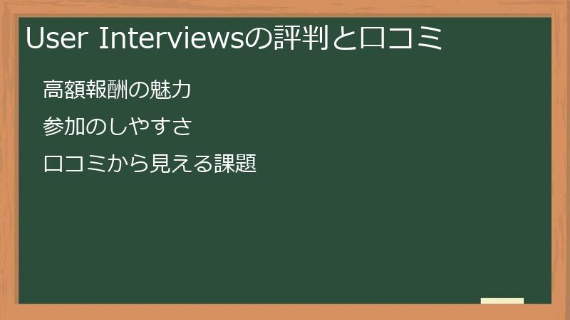User Interviewsは、高額報酬が魅力的なサービスとして注目を集めていますが、実際に利用したユーザーからは、様々な意見が出ています。