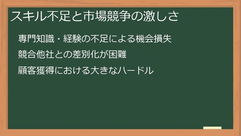 さらに、スキル不足や市場競争の激しさ、そして、信用問題や法的リスクも無視できません。