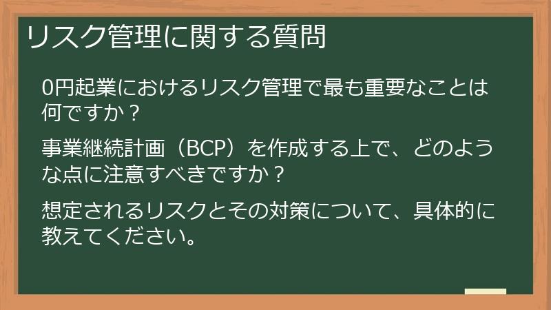 ビジネスモデルを転換し、事業を拡大したとしても、リスクは常に存在します。 このセクションでは、事業継続のためのリスク管理、事業承継、そしてEXIT戦略などに関するよくある質問とその回答をまとめました。 予期せぬ事態に備え、事業を継続・発展させるための戦略を学びます。 事業継続のためのリスク管理戦略を学ぶ上で、このセクションは非常に重要です。 長期的な視点に立ったリスク管理は、事業の安定した成長に繋がります。