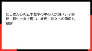 にじさんじ にじさんじの五木左京の中の人が顔バレ?前世・転生と炎上理由、彼氏・彼女との関係も暴露 にじさんじのスーパーエリート営業マン、五木左京の「中の人」を徹底解剖! にじさんじの新星として2025年4月にデビューした五木左京(いつきさきょう)。スーツ姿の端正なビジュアルと、寡黙そうな外見とは裏腹の熱い営業トークで、瞬く間にファン... 2025.10.19 にじさんじ