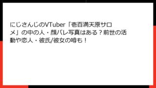 にじさんじ にじさんじのVTuber「壱百満天原サロメ」の中の人・顔バレ写真はある?前世の活動や恋人・彼氏/彼女の噂も! 壱百満天原サロメの「中の人」完全考察:にじさんじの令嬢VTuberの裏側に迫る にじさんじ所属のVTuber、壱百満天原サロメ(ひゃくまんてんばら・さろめ)。2022年5月のデビュー以来、瞬く間にチャンネル登録者数100万人を突破し、V... 2025.10.15 にじさんじ