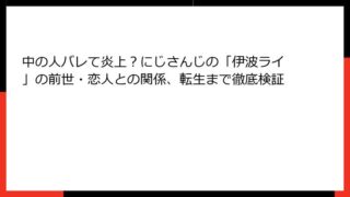 にじさんじ 中の人バレて炎上?にじさんじの「伊波ライ」の前世・恋人との関係、転生まで徹底検証 にじさんじの輝くヒーロー、伊波ライの「中の人」を深掘り!歌声の秘密と意外な素顔 にじさんじ所属のVTuber、伊波ライ(いなみらい)。2023年4月のデビュー以来、その爽快な歌声とギターの腕前、多才なエンターテイナーぶりでファンを魅了し... 2025.10.13 にじさんじ