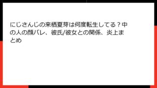 にじさんじ にじさんじの来栖夏芽は何度転生してる?中の人の顔バレ、彼氏/彼女との関係、炎上まとめ 来栖夏芽の「中の人」を探る:にじさんじのミステリアスな新人作家 にじさんじ所属のVTuber、来栖夏芽(くるす・なつめ)。音楽と羊をこよなく愛する彼女は、配信者としてだけでなく、小説家としても活躍するマルチタレントだ。デビュー以来、AS... 2025.10.13 にじさんじ