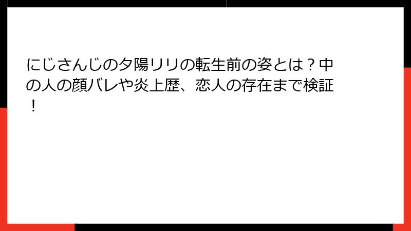 にじさんじの人気VTuber、夕陽リリさんは、未来から来たというユニークな設定と中性的な声質で多くのファンを魅了しています。明るく悪戯好きなキャラクターで知られ、ゲーム実況や歌ってみた、コラボ配信などで活躍中です。VTuber文化において、ファンの間で特に注目されるのが「顔バレ」—つまり、VTuberの「中の人」の素顔やリアルな姿に関する情報です。夕陽リリさんの場合、顔バレに関する明確な情報は存在しないものの、ファンコミュニティではさまざまな推測やエピソードが飛び交っています。本記事では、夕陽リリさんの「顔バレ」に関する話題を、配信やX(旧Twitter)の反応、にじさんじのポリシーを基に詳しく掘り下げます。2025年9月16日現在、公式な顔バレ情報はなく、すべて推測や考察の範囲内で進めます。VTuberのプライバシーを尊重しつつ、読み応えのある内容をお届けします。