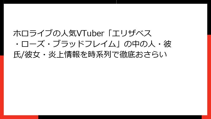 ホロライブEnglish -Justice-の輝くリーダー、エリザベス・ローズ・ブラッドフレイム。2024年6月のデビュー以来、彼女の歌声とカリスマは世界中のファンを魅了し続けています。しかし、VTuber界の華やかな舞台裏では、どんなタレントも小さな誤解や論争に巻き込まれることがあります。この記事では、エリザベスの「炎上」に関するエピソードを、コミュニティの議論や配信の振り返りを基に詳しく探ります。幸い、彼女のキャリアは比較的クリーンですが、VTuber特有のセンシティブな話題が時折波紋を呼んでいます。あくまで推測やファンの反応を交えた内容ですので、冷静に読み進めてください。それでは、緋色の女王の試練に目を向けましょう。