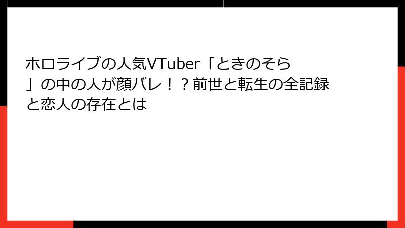 ホロライブの0期生としてVTuber界にその名を刻むときのそら。彼女の透明感あふれる歌声と温かな人柄は、2017年のデビュー以来、数え切れないファンを魅了してきました。しかし、VTuberの裏側には常に囁かれる「前世」や「転生」の話題があります。そらちゃんの「中の人」やその過去、そして転生にまつわる噂を、ファンの間で語り継がれる情報を基に紐解いていきます。公式には明かされていないこのミステリーを、ブログ形式でじっくりと探求しましょう! そらとも(そらちゃんのファン)必見の読み応えをお届けします。