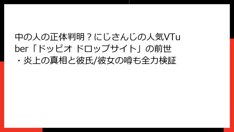 2025年10月21日現在、ドッピオ・ドロップサイトの顔バレ情報は一切存在しません。にじさんじのVTuberは、契約上、リアルな姿を公開することが禁止されており、配信中の事故(カメラの誤作動など)による顔バレも報告されていません。ドッピオの場合、配信環境がプロフェッショナルに管理されており、顔が映るようなミスは起こりにくい状況です。以下は、顔バレがない理由のポイントです。
