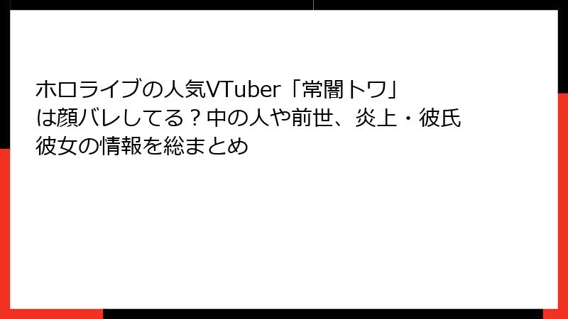 | ファンへの影響 | 常闇眷属は「トワ様の配信を楽しむのが一番」と、顔バレよりコンテンツを重視。過度な詮索を控える暗黙の了解。 |