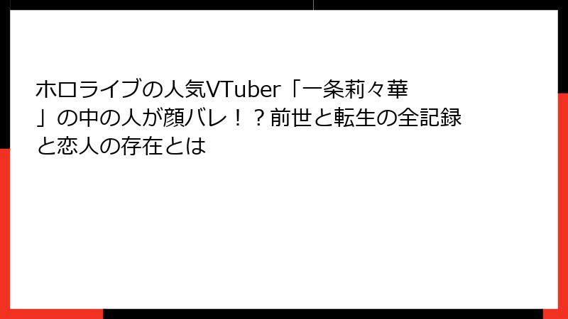 結論から言うと、2025年10月25日現在、一条莉々華の「中の人」の顔バレ情報は一切存在しません。ホロライブはVTuberのプライバシー保護に厳格で、顔写真や個人情報が漏洩するケースは極めて稀です。それでも、ファンの間で顔バレの噂が立つ理由を以下にまとめます。