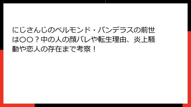 にじさんじ所属のVTuber、ベルモンド・バンデラス。低音ボイスで語る夢の世界のバーマスターとして、ファンを魅了し続ける彼の配信は、ゲーム実況から雑談、歌ってみたまで幅広い魅力に満ちています。しかし、VTuberの醍醐味の一つといえば「中の人」の存在。ベルモンド・バンデラスの裏側にいる人物は、誰なのか? 今回は、ネット上の情報や活動履歴を基に、その謎に迫ってみましょう。低音の響きが大塚明夫を思わせる声の持ち主として、デビュー当時から注目を集めてきた彼の前世(中の人)は、意外な人物にたどり着きます。さあ、グラスを傾けながら、一緒に探訪を始めましょう。