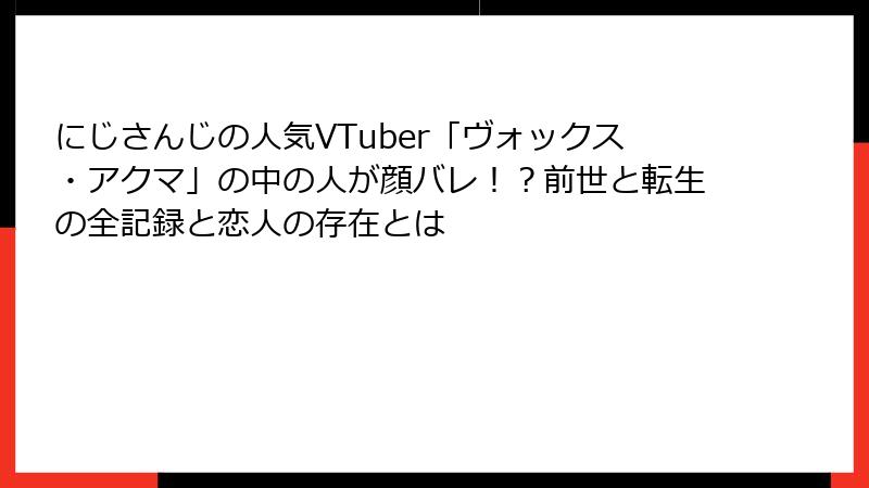 にじさんじENの人気VTuber、ヴォックス・アクマ。彼の低音でセクシーな声とミステリアスなキャラクターは、世界中のファンを魅了してきました。2021年のデビュー以来、ASMR配信やゲーム実況、さらには映画制作にまで手を広げ、YouTube登録者数100万人を突破するなど、驚異的な活躍を続けています。しかし、そんな彼の裏側にいる「中の人」――つまり、声優や前世活動者についての情報は、VTuber界の永遠の謎として語り継がれています。この記事では、信頼できる情報源から集めた推測と詳細を基に、ヴォックス・アクマの「中の人」を深掘りします。プライバシーを尊重しつつ、読み応えのあるストーリーをお届けしましょう。