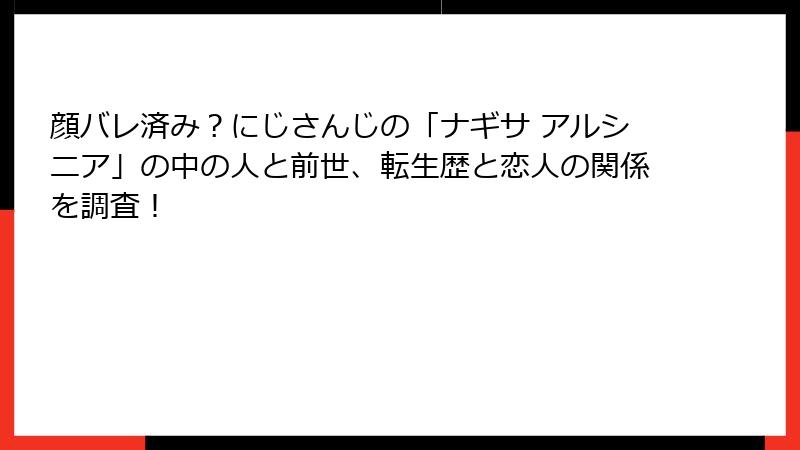 結論:**ナギサ・アルシニアの顔バレは2025年11月12日現在、完全ゼロ**! ニアミスすらエンタメに変える彼女のミステリーは、VTuberの理想形です。公式の鉄壁ガードとファンのリスペクトが守るこの記録は、永遠に破られないかも? 実顔より、画面越しの笑顔を愛していきましょう。もし(絶対ない)顔バレが起きたら…即更新します! 皆さんの「妄想ナギサ」もコメントで待ってます♪