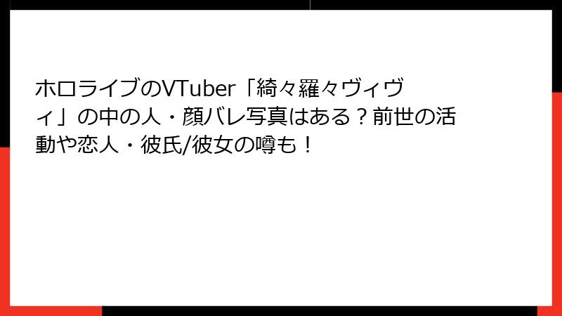 ホロライブDEV_IS所属の人気VTuber、綺々羅々ヴィヴィ(通称:ヴィヴィ)。2024年11月9日のデビュー以来、関西弁の毒舌トークとコスメ愛でファンを魅了し続けています。チャンネル登録者数30万人超えの彼女ですが、ファンの間で密かに盛り上がるのが「彼氏(もしくは彼女)」「恋人」の存在。VTuberとして設定上は「美の求道者」ですが、ストレートな性格がもたらす「リアルすぎる恋愛トーク」が、ネットをざわつかせています。