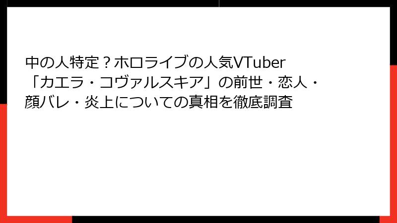 ホロライブプロダクションのインドネシア支部(hololive ID)3期生として2022年3月にデビューしたカエラ・コヴァルスキア。彼女のクールでランダムな魅力にハマるファンが急増中だ。そんなカエラの「中の人」(前世や素顔の活動者)について、今回は徹底的に掘り下げてみよう。VTuber界の慣習として、公式には明かされない部分が多いけど、ファンの間で広く共有されている情報を基に、読み応え満載でお届けするよ。カエラの魅力がさらに深まるはず!