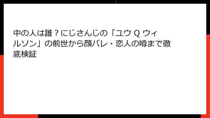 にじさんじENの第8期生「Krisis」ユニットの一員として2023年にデビューしたユウ Q ウィルソン。クールでプロフェッショナルなヒットマンのキャラクターが魅力的なこのVTuberは、英語とフランス語を操るグローバルな活躍でファンを魅了しています。しかし、VTuber界の永遠の謎である「中の人」——つまり、彼の声やパフォーマンスを支える実在の人物——について、ファンの間でさまざまな推測が飛び交っています。この記事では、公式情報が限定的な中、信頼できるソースから集めた事実と噂を基に、ユウ Q ウィルソンの「中の人」を多角的に掘り下げます。プライバシーを尊重しつつ、読み応えのあるストーリーをお届けします。