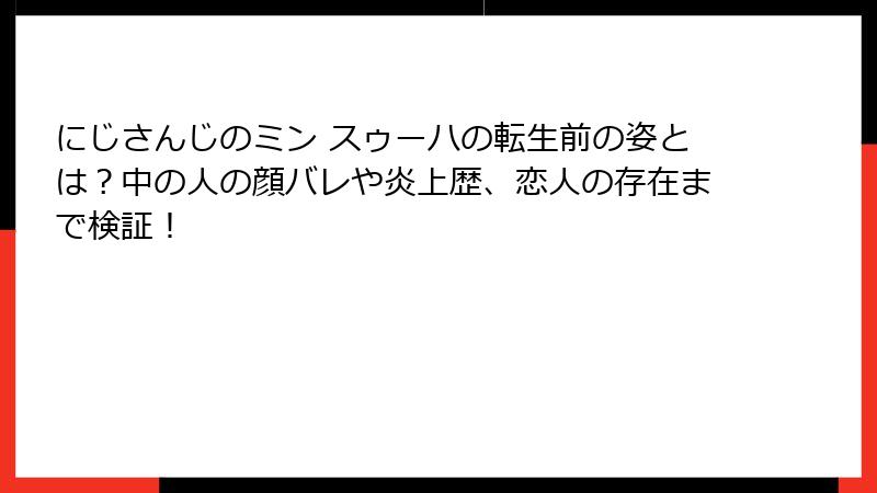 にじさんじ所属のミン・スゥーハは、穏やかな歌声とゲーム配信でファンを癒す存在として知られています。デビューから5年以上経った今も、韓国語・日本語・英語を操るトリリンガルな魅力で国際的な人気を博しています。しかし、VTuber界隈でよく語られる「前世」(デビュー前の活動歴)や「転生」(過去の活動から新しいキャラクターへの移行)については、公式情報が一切なく、ファンの間でさまざまな憶測が飛び交っています。この記事では、公開されている限られた情報とファンの推測を基に、ミン・スゥーハの「前世」と「転生」の可能性を探ります。プライバシーを尊重しつつ、読み応えのある考察をお届けします。
