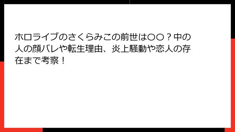 | 2024年9月 | 同棲相手のnote投稿 | 「さくらみこと同棲中」との投稿がSNSを騒然とさせたが、偽アカウントのデマと発覚。社内では「公然の秘密」との声もあったが、証拠なし。 |