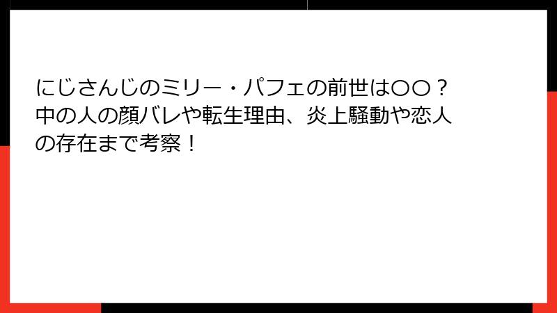 まとめ「前世」「転生」はVTuber文化の一側面ですが、演者のプライバシーを守るため、具体的な個人情報の拡散は控えるべきです。にじさんじの魅力はキャラクターと演者のパフォーマンスそのものにあります。純粋に配信を楽しんで、推しライバーを応援しましょう。 にじさんじVTuberの「彼氏(もしくは、彼女)」「恋人」について