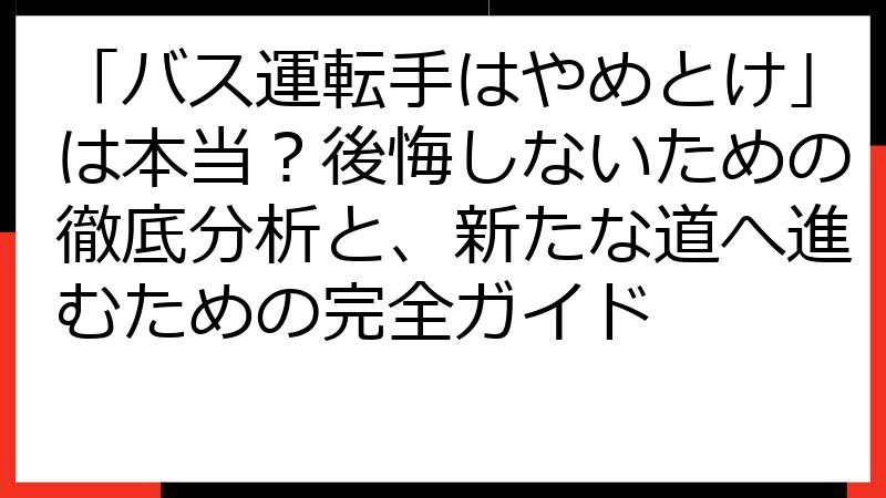 バス運転手の仕事のリアルな現状から、辞めるべきかどうかの判断基準、そして、転職に関する疑問まで、幅広くカバーしています。
