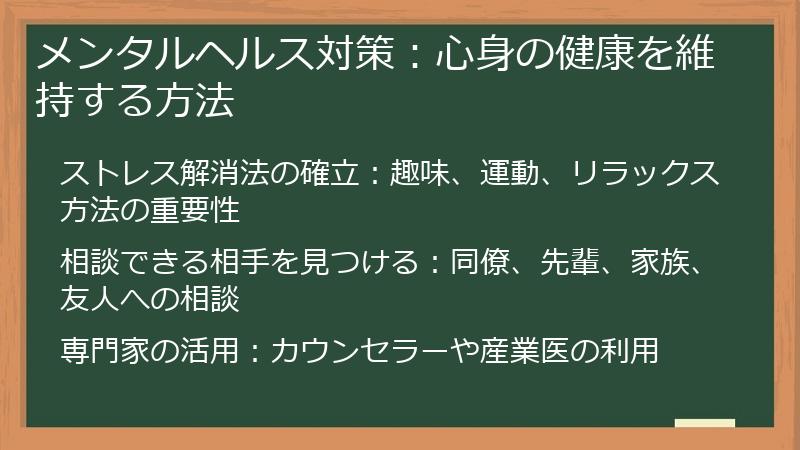 - 専門家の活用:カウンセラーや産業医など、専門家のサポートを受けることも有効です。