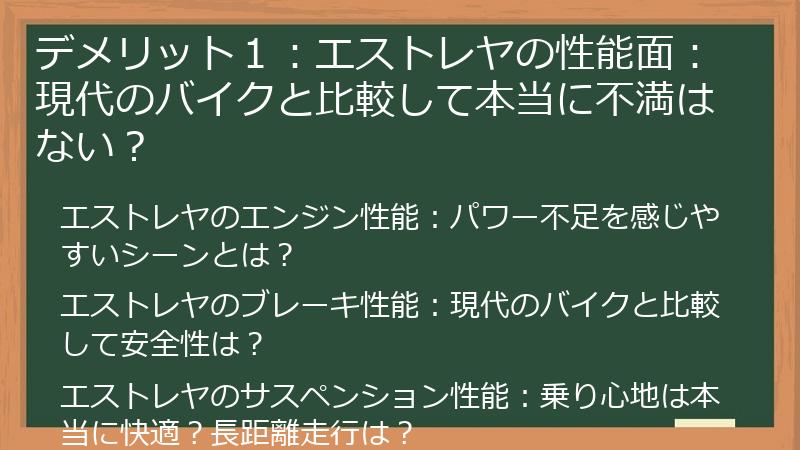 パワー不足を感じやすいシーンや、安全面での懸念点などを明確にし、あなたが実際にエストレヤに乗る上で、どこまで妥協できるのかを考える手助けをします。