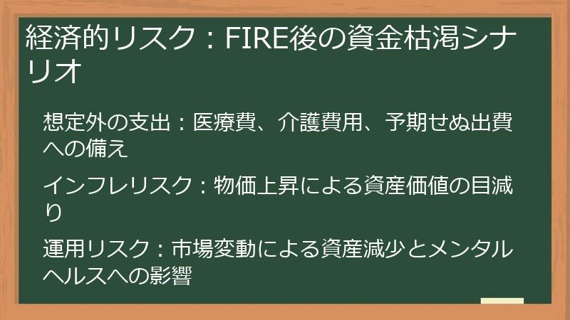 このセクションでは、FIRE後に資金が枯渇してしまう可能性のあるシナリオを具体的に解説します。