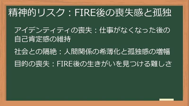 FIREは経済的な自由を得るための手段ですが、同時に精神的なリスクも伴います。