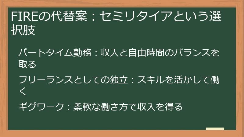 - FIRE後も、パートタイムで働いたり、副業で収入を得たりすることで、経済的な余裕を持つことができます。