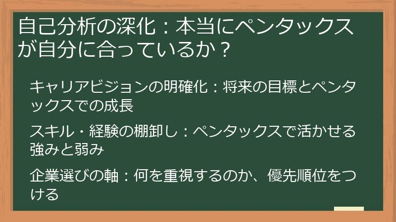 ペンタックスへの理解を深め、自分にとって最適なキャリアパスを見つけるために、ぜひご活用ください。