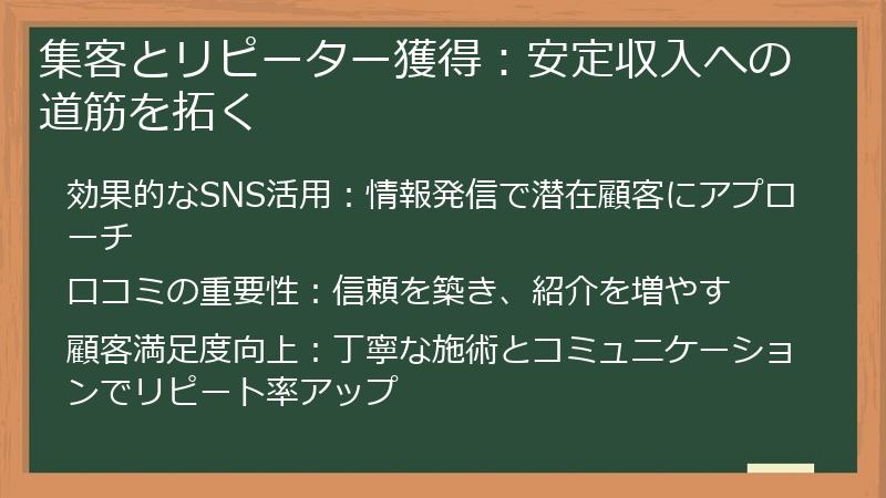 - 顧客に満足してもらえる施術を提供し、リピーターを増やしましょう。